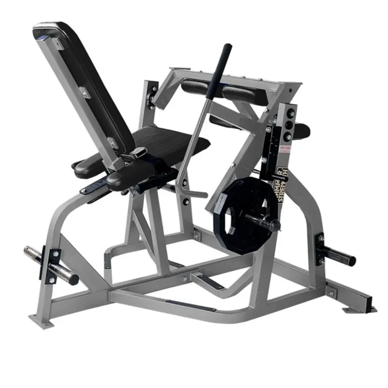 The Hammer Strength Plate Loaded Iso-Lateral Leg Extension isolates the quadriceps, providing a focused workout for the front of the