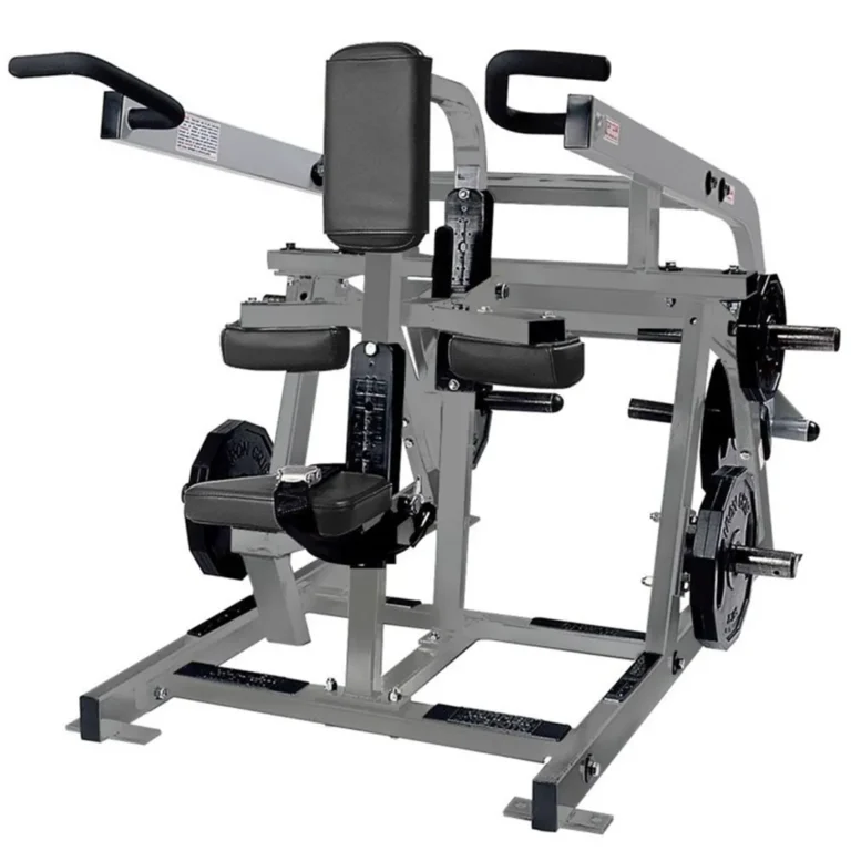 The Hammer Strength Plate Loaded Iso-Lateral Low Row targets the lower back, lats, and rear deltoids, providing a low-rowing motion